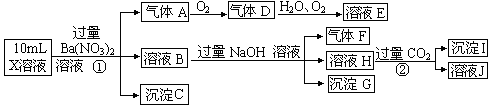 (15分)某強酸性溶液X含有Ba2+、Al3+、NH4+、Fe2+、Fe3+、CO32-、SO32-、SO42-、NO3-中的一種或幾種,取該溶液進行連續(xù)實驗,實驗內(nèi)容如下:![]()