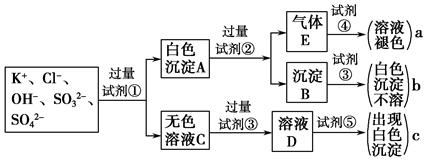 某無色溶液中含有K+、Cl-、OH-、SO32-、SO42-,為檢驗溶液中所含的各種陰離子,限用的試劑有:鹽酸、硝酸、硝酸銀溶液、硝酸鋇溶液、溴水和酚酞試液。檢驗其中OH-的實驗方法從略,檢驗其他陰離子的過程如下圖所示。![]()