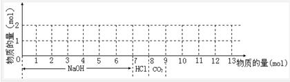g2+和1 mol Al3+的混合溶液,現(xiàn)按下圖橫坐標(biāo)依次加入7 mol NaOH溶液、1 mol鹽酸,通入1 mol CO2氣體,縱坐標(biāo)為混合沉淀的物質(zhì)的量。請畫出沉淀的量隨反應(yīng)的變化曲線,并寫出各步反應(yīng)的離子方程式。![]()
