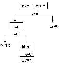 某溶液中含有Ba2+,Cu2+,Ag+,現(xiàn)用NaOH溶液、鹽酸和Na2SO4溶液將這三種離子逐一沉淀分離。其流程圖如右(寫(xiě)出最佳答案)![]()