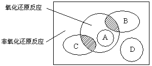 (5分)圖中方框內區(qū)域表示所有的化學反應,大圈內區(qū)域表示氧化還原反應,大圈外區(qū)域表示非氧化還原反應,其中A~D分別表示四種基本反應類型。請分別填出:![]()