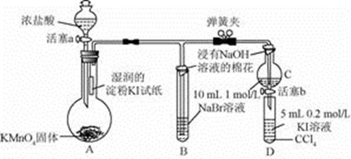 為了比較鹵素單質(zhì)的氧化性強弱可在實驗室先制取Cl2(利用MnO2與濃鹽酸反應(yīng)可制取Cl2)并將Cl2依次通入NaBr溶液和KI淀粉溶液中。如圖所示儀器及藥品試回答:?![]()