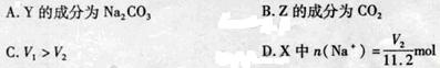 將一定量的NaOH和NaHCO3的混合物X放在密閉容器中加熱,充分反應(yīng)后生成V1L氣體Z(V1≠0)。反應(yīng)后的固體殘渣Y與過量的稀鹽酸反應(yīng),又生成V2L氣體Z(V1、V2均為標準狀況下氣體的體積)。下列判斷錯誤的是( )![]()