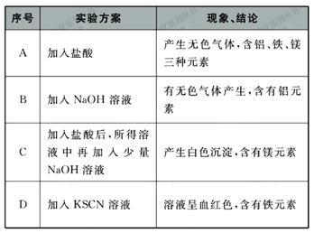 易拉罐主要為鋁合金,其中以鋁鐵合金和鋁鎂合金最為常見,F(xiàn)取幾小塊易拉罐碎片進(jìn)行下列實(shí)驗(yàn),其中實(shí)驗(yàn)方案與現(xiàn)象、結(jié)論均正確的是( ) ![]()
