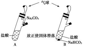 有A、B兩個完全相同的裝置,某學生分別在它們的側管中裝入1.06 g Na2CO3和0.84 g NaHCO3,A、B中分別有10 mL相同濃度的鹽酸,將兩個側管中的物質同時倒入各自的試管中,下列敘述正確的是( )![]()