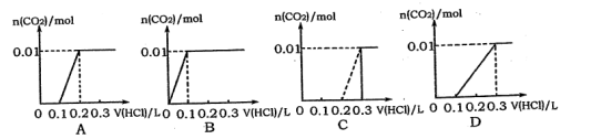 將0.4gNaOH和1.06g Na2CO3混合并配成溶液,向溶液中滴加0.1 mol·L-l的鹽酸。下列圖像能正確表示加入鹽酸的體積和生成C02的物質(zhì)的量的關(guān)系的是![]()