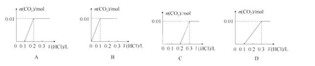 將0.4gNaOH和1.06gNa2CO3混合并配成溶液,向溶液中滴加0.1 mol·L-1稀鹽酸。下列圖象能正確表示加入鹽酸的體積和生成CO2的物質(zhì)的量的關(guān)系的是![]()