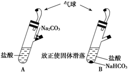 有A、B兩個完全相同的裝置,某學(xué)生分別在它們的側(cè)管中裝入1.06 g Na2CO3和0.84 g NaHCO3,A、B中分別有10 mL相同濃度的鹽酸,將兩個側(cè)管中的物質(zhì)同時倒入各自的試管中,下列敘述正確的是![]()