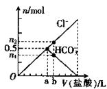 向某碳酸鈉溶液中逐滴加1 mol·L─1的鹽酸,測得溶液中Cl─、HCO3─的物質(zhì)的量隨加入鹽酸體積的關系如圖所示,其中n2:n1=3:2,則下列說法中正確的是 ( )![]()