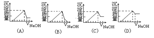 有一塊鎂鋁合金,其中鎂與鋁的質(zhì)量比是8:9。加入足量稀H2SO4使其完全溶解后,再加入NaOH溶液,生成沉淀的質(zhì)量隨NaOH溶液體積變化的曲線如下圖,其中正確的是( )![]()