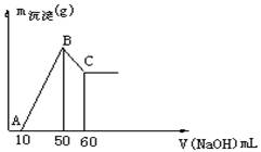 某無色溶液中含有H+、Al3+、Mg2+三種陽離子,逐滴加入0.1moL·L-1 NaOH溶液,消耗NaOH溶液體積(X軸)和生成沉淀(Y軸)之間的函數(shù)關(guān)系如下圖所示,則溶液中H+、Al3+、Mg2+三種陽離子的物質(zhì)的量濃度之比為( )![]()