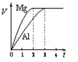 鎂和鋁分別與等濃度、等體積的過量稀硫酸反應(yīng),產(chǎn)生氣體的體積(V)與時(shí)間(t)關(guān)系如圖。關(guān)于反應(yīng)中鎂和鋁的說法正確的是( 。![]()