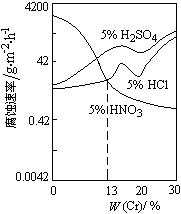 | C.Cr含量大于13%時,因為三種酸中硫酸的氫離子濃度最大,所以對Fe-Cr合金的腐蝕性最強(qiáng) |