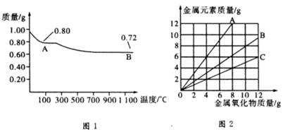 銅有兩種常見(jiàn)的氧化物CuO和Cu2O。某學(xué)習(xí)小組取0.98g(用精密天平測(cè)量)Cu(OH)2固體加熱,有銅的氧化物生成,其質(zhì)量隨溫度變化如圖1所示:另外,某同學(xué)繪制了三條表示金屬氧化物與其所含金屬元素的質(zhì)量的關(guān)系曲線,如圖2所示。則下列分析正確的是( )![]()