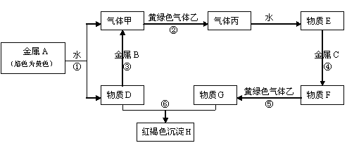 (10分)現(xiàn)有常見金屬單質(zhì)A、B、C和常見氣體甲、乙、丙及物質(zhì)D、E、F、G、H,它們之間能發(fā)生如下反應(yīng)(圖中有些反應(yīng)的產(chǎn)物和反應(yīng)的條件沒有全部標(biāo)出)。![]()