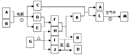 (11分)下圖表示各物質(zhì)之間的轉(zhuǎn)化關(guān)系。已知:常溫下D、E、F、I、J為氣體,H、I、J都為氧化物,C的焰色反應(yīng)為黃色,M為紅褐色固體。![]()