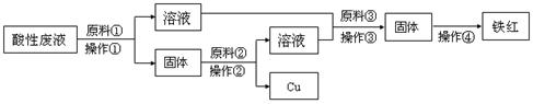 (6分) 刻制印刷電路板得到的酸性廢液中含有大量的FeCl2、CuCl2、FeCl3。為了減少污染并變廢為寶,工程師們設(shè)計了如下流程,以常用的酸、堿和廢鐵屑為原料回收銅和制備鐵紅(Fe2O3)。![]()