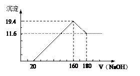 H溶液,生成的沉淀跟加入的NaOH溶液的體積關(guān)系如圖。(橫坐標(biāo)體積單位是mL,縱坐標(biāo)質(zhì)量單位是g)求: ![]()