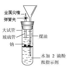 (10分)有人設(shè)計(jì)出一種在隔絕空氣下讓鈉與水反應(yīng)的方法,利用煤油來(lái)控制反應(yīng)速率。使學(xué)生能仔細(xì)觀察到各種實(shí)驗(yàn)現(xiàn)象。該方法簡(jiǎn)便、安全、現(xiàn)象明顯、有趣味性。實(shí)驗(yàn)裝置如圖所示,將規(guī)格為6×55 mm玻璃管和長(zhǎng)頸漏斗插入橡皮孔中,玻璃管外套上30 mm的乳膠管,乳膠管上再接規(guī)格為6×30 mm金屬尖嘴管,乳膠管上夾上彈簧夾。