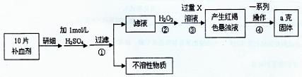 硫酸亞鐵晶體(FeSO4·7H2O)在醫(yī)藥上作補血劑。某課外研究小組測定該補血劑中鐵元素的含量,實驗步驟如下:![]()