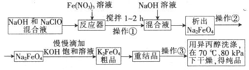 高鐵酸鉀是一種高效的多功能水處理劑,具有氧化、吸附、絮凝、、助凝、殺菌、除臭等作用,高鐵酸鉀的開發(fā)和利用正日益顯示出其廣闊的應(yīng)用前景。其制備路線如下:![]()