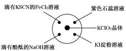 已知:KClO3+6HCl(濃)===KCl+3Cl2↑+3H2O.如圖所示,將少量試劑分別放入培養(yǎng)皿中的相應(yīng)位置,實(shí)驗(yàn)時(shí)將濃鹽酸滴在KClO3晶體上,并用表面皿蓋好.下表中由實(shí)驗(yàn)現(xiàn)象得出的結(jié)論完全正確的是![]()