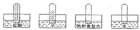 四支試管分別充滿O2、NO2、C12、NH3四種氣體,把它們分別倒立于盛有下列各種液體的水槽中,發(fā)生的現(xiàn)象如下圖所示,其中充滿C12的試管是( )![]()