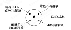 已知:KClO3+6HCl(濃)===KCl+3Cl2↑+3H2O.如圖所示,將少量試劑分別放入培養(yǎng)皿中的相應(yīng)位置,實驗時將濃鹽酸滴在KClO3晶體上,并用表面皿蓋好.下列描述正確的是 ( )