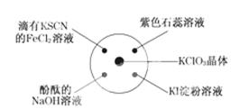 已知:KClO3+6HCl(濃)===KCl+3Cl2↑+3H2O、如圖所示,將少量試劑分別放入培養(yǎng)皿中的相應(yīng)位置,實(shí)驗(yàn)時(shí)將濃鹽酸滴在KClO3晶體上,并用表面皿蓋好、下列描述正確的是 ![]()