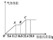 常溫下,某200mL稀硫酸和稀硝酸的混合溶液最多能溶解19.2g銅粉(已知硝酸只被還原為NO氣體),若再取等體積的該混合酸向其中逐漸加入鐵粉,產(chǎn)生氣體的量隨鐵粉質(zhì)量增加的變化如圖所示。下列有關(guān)分析錯(cuò)誤的是![]()