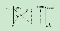 鐵在熱的稀HNO3中反應(yīng),其主要還原產(chǎn)物為N2O,而在冷的稀HNO3中反應(yīng),其主要還原產(chǎn)物為NO,當(dāng)HNO3更稀時(shí),其主要還原產(chǎn)物是NH4+.現(xiàn)有鐵與稀HNO3作用,請(qǐng)分析下圖(假設(shè)曲線的各段內(nèi)只有一種還原產(chǎn)物)中c、d(d點(diǎn)后不再有化學(xué)反應(yīng)發(fā)生)兩點(diǎn)橫坐標(biāo)的數(shù)值之比為![]()