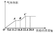 常溫下,某200mL稀硫酸和稀硝酸的混合溶液最多能溶解19.2g銅粉(已知硝酸只被還原為NO氣體),若再取等體積的該混合酸向其中逐漸加入鐵粉,產(chǎn)生氣體的量隨鐵粉質(zhì)量增加的變化如圖所示。下列有關(guān)分析錯(cuò)誤的是( )![]()