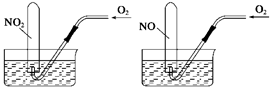 如圖所示,相同條件下,兩個(gè)容積相同的試管分別裝滿NO2和NO氣體,分別倒置于水槽中,然后通過導(dǎo)管緩慢通入氧氣,邊通邊慢慢搖動試管,直到兩個(gè)試管內(nèi)充滿液體。假設(shè)試管內(nèi)的溶質(zhì)不向水槽中擴(kuò)散,則兩個(gè)試管內(nèi)溶液物質(zhì)的量濃度之比為 ( )![]()