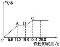 [2012·商丘三模] 某稀硫酸和稀硝酸的混合溶液200 mL,平均分成兩份。向其中一份中逐漸加入銅粉,最多能溶解19.2 g(已知硝酸只被還原為NO氣體)。向另一份中逐漸加入鐵粉,產(chǎn)生氣體的量隨鐵粉質(zhì)量增加的變化如圖所示。下列分析或結(jié)果不正確的是( )![]()