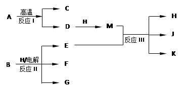 (10分)下圖所示反應I、反應II和反應III均是工業(yè)生產(chǎn)中常見的反應。其中A、B為化合物,C是溫室氣體之一,D和K均可用做干燥劑,H常溫下為液態(tài)化合物,J是一種具有漂白作用的鹽,反應III和E與G反應的原理相同。![]()
