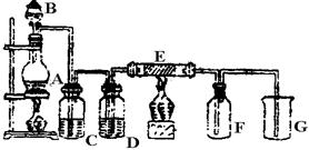 (10分)下圖是實(shí)驗(yàn)室制取并收集Cl2的裝置。A是Cl2發(fā)生裝置,,E是硬質(zhì)玻璃管中裝有細(xì)鐵絲網(wǎng);F為干燥的廣口瓶,燒杯G為尾氣吸收裝置。![]()