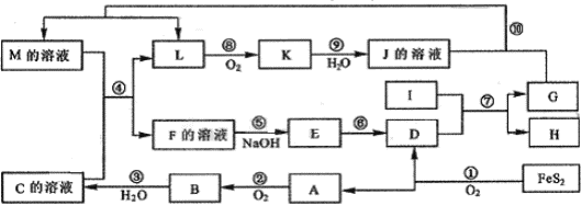 (10分)下圖是無機(jī)物A~M在一定條件下的轉(zhuǎn)化關(guān)系(部分產(chǎn)物及反應(yīng)條件未列出)。其中,I是由第三周期元素組成的單質(zhì)中熔點(diǎn)最高的金屬,K是一種紅棕色氣體。![]()