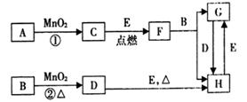 (1)若C是可用于自來水消毒的氣體,A生成的B的反應為工業(yè)上冶煉金屬B的反應,反應條件為電解,D、E是氧化物,D轉(zhuǎn)化為E時增加氧的質(zhì)量是總質(zhì)量的25.8%,則寫出A在一定條件下生成的C方程式 , E的電子式為