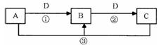 A、B、C、D是中學化學的常見物質(zhì),其中A、B、C均含有同一種元素。在一定條件下相互轉(zhuǎn)化的關(guān)系如下圖所示(部分反應中的H2O已略去)。請?zhí)羁眨?br />![]()