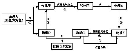 (14分)現(xiàn)有金屬單質(zhì)A、B、C、I和氣體甲、乙、丙及物質(zhì)D、E、F、G、H。其中B是地殼中含量最多的金屬。它們之間能發(fā)生如下反應(yīng)(圖中有些反應(yīng)的產(chǎn)物和反應(yīng)的條件沒有全部標(biāo)出)。![]()