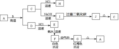 (10分)A是一種紅棕色金屬氧化物,B、D是金屬單質(zhì),J是一種難溶于水的白色化合物,受熱后容易發(fā)生分解。![]()