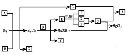 (12分)Mg及其化合物可以發(fā)生如下轉(zhuǎn)化(部分反應(yīng)物、生成物或水已略去),已知X、Y、Z為氣態(tài)單質(zhì),B常溫下為液態(tài),化合物D的焰色反應(yīng)為黃色,C和G混合冒白煙并生成A,電解E的水溶液常用于某種工業(yè)生產(chǎn)。![]()