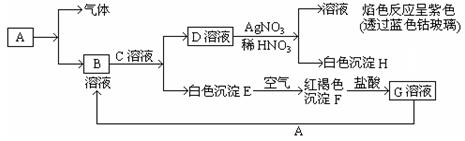 (8分)A、B兩種酸式含氧酸鹽的相對(duì)分子量均為120,且都溶于水;D氣體能使品紅溶液褪色;F固體為淡黃色;E是不溶于水和鹽酸的白色沉淀,它們之間的轉(zhuǎn)化關(guān)系如圖所示:![]()