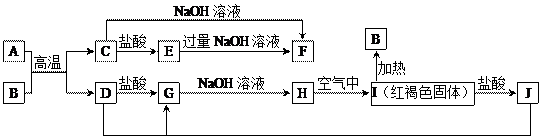 下圖中A~J均為中學(xué)化學(xué)中常見(jiàn)的物質(zhì),它們之間有如下轉(zhuǎn)化關(guān)系。其中A、D為金屬單質(zhì),B是一種紅棕色固體。(反應(yīng)過(guò)程中