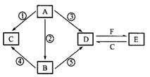 的化工原料,也是實(shí)驗(yàn)室常用的藥品,C、D在一定的條件下可相互轉(zhuǎn)化,F(xiàn)與A、B、C、D在一定的條件下均可發(fā)生反應(yīng),它們的部分轉(zhuǎn)化關(guān)系如下圖(部分反應(yīng)物或生成物省略)。![]()
