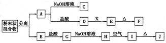 (6分)某化學興趣小組用含A、B兩種金屬單質的粉末狀混合物進行如下實驗,其轉化關系如下圖所示(部分反應物和生成物未列出),其中E為白色膠狀沉淀,I為紅褐色沉淀。(此轉化關系中所用的試劑都是足量的)![]()