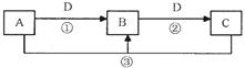 (14分)A、B、C、D是中學化學的常見物質(zhì),其中A、B、C均含有同一種元素。在一定條件下相互轉(zhuǎn)化的關(guān)系如下圖所示(部分反應(yīng)中的H2O已略去)。請?zhí)羁眨?br />![]()