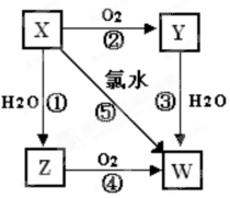 (9分)已知X氣體是一種無色有刺激性氣味的酸性氧化物,有關(guān)X、Y、Z、W的轉(zhuǎn)化關(guān)系如下,反應(yīng)①~④均為化合反應(yīng);卮鹣铝袉栴}: