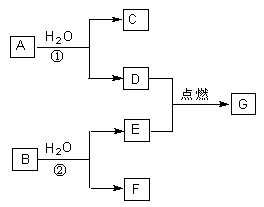 (8分)A、B、C、D、E、F、G七種物質(zhì)中,其中A、D、E為單質(zhì),且D、E為氣態(tài),G為液態(tài),它們之間存在如下轉(zhuǎn)化關(guān)系:![]()
