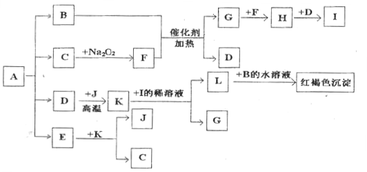 (10分)將一定量的晶體A,隔絕空氣加熱到200OC時(shí),全部分解為B、C、D、E四種氣體,且其物質(zhì)的量之比為2:1:l:1。這四種氣體物質(zhì)與其它物質(zhì)的相互轉(zhuǎn)化關(guān)系如下圖所示。J是一種常見(jiàn)金屬單質(zhì),C在固體時(shí)可用于人工降雨,D常溫下是一種無(wú)色液體,F(xiàn)是一種可助燃的氣體單質(zhì),固體K是具有磁性的黑色晶體。圖中部分反應(yīng)條件及生成物沒(méi)有列出:![]()